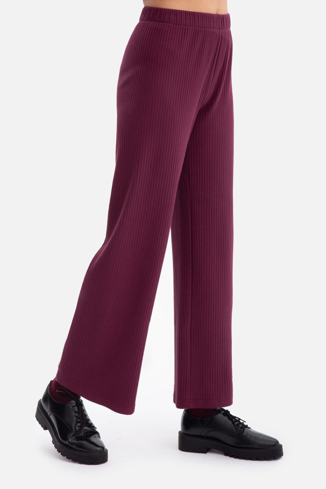 SPODNIE Z DZIANINY PRĄŻKOWANEJ – ŚLIWKOWE