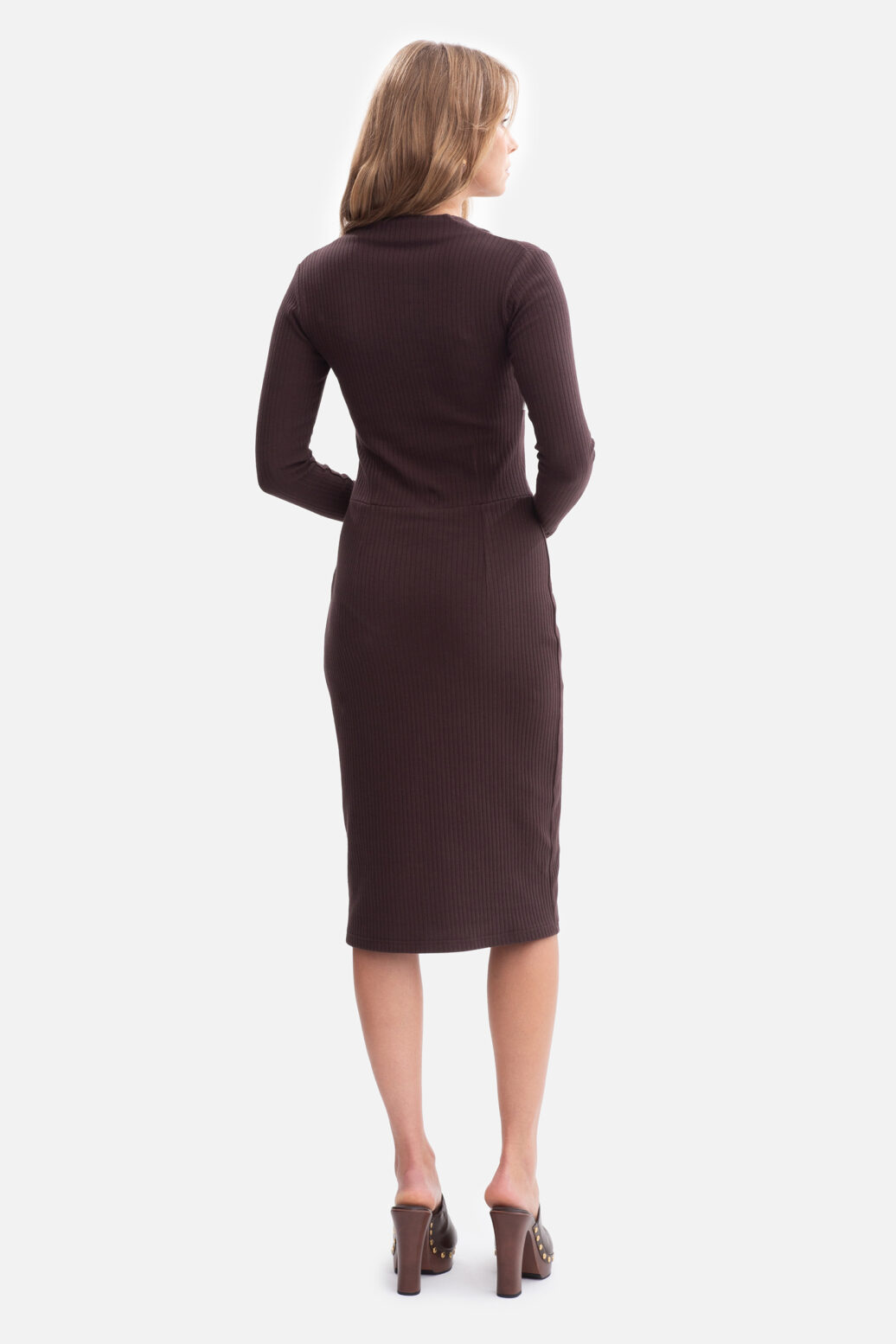 SUKIENKA MIDI Z DZIANINY PRĄŻKOWANEJ Z DEKOLTEM – GORZKA CZEKOLADA