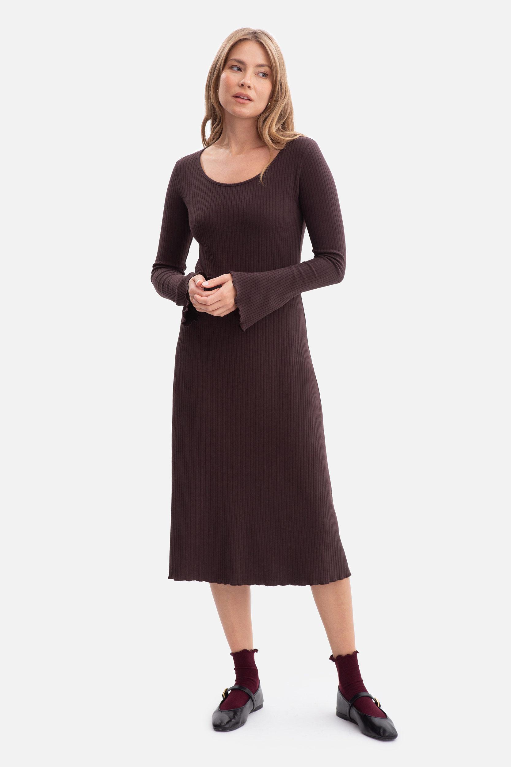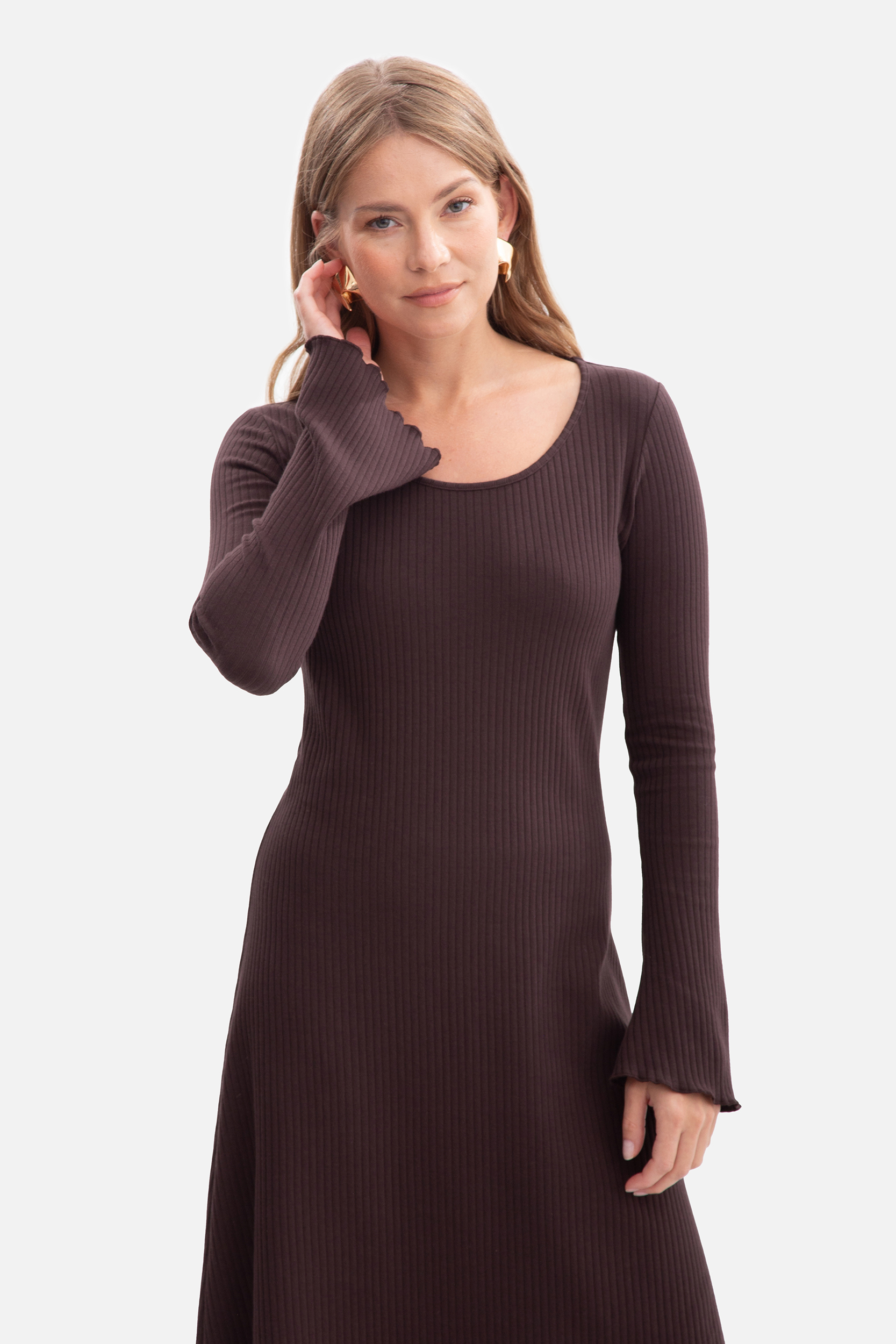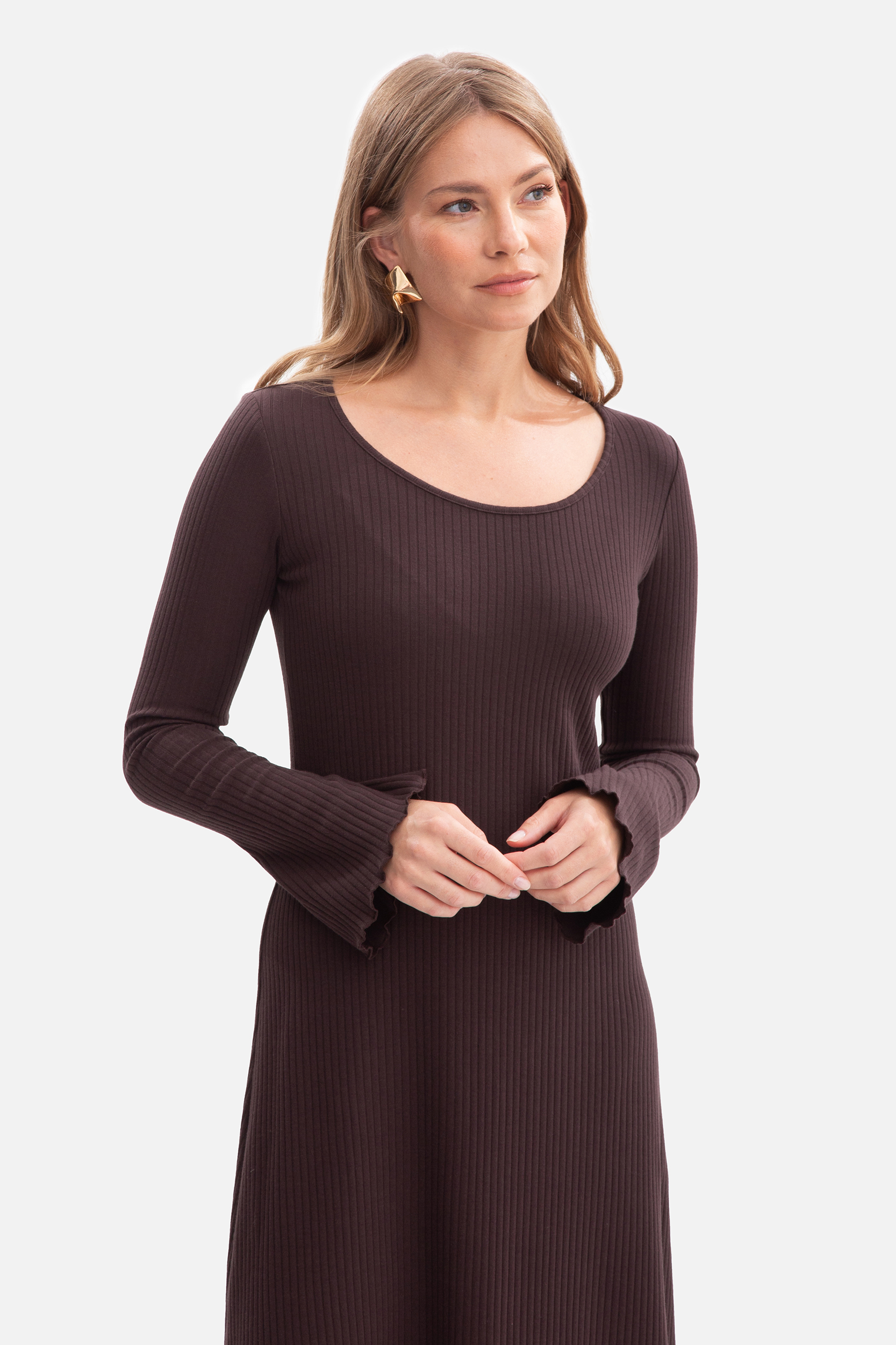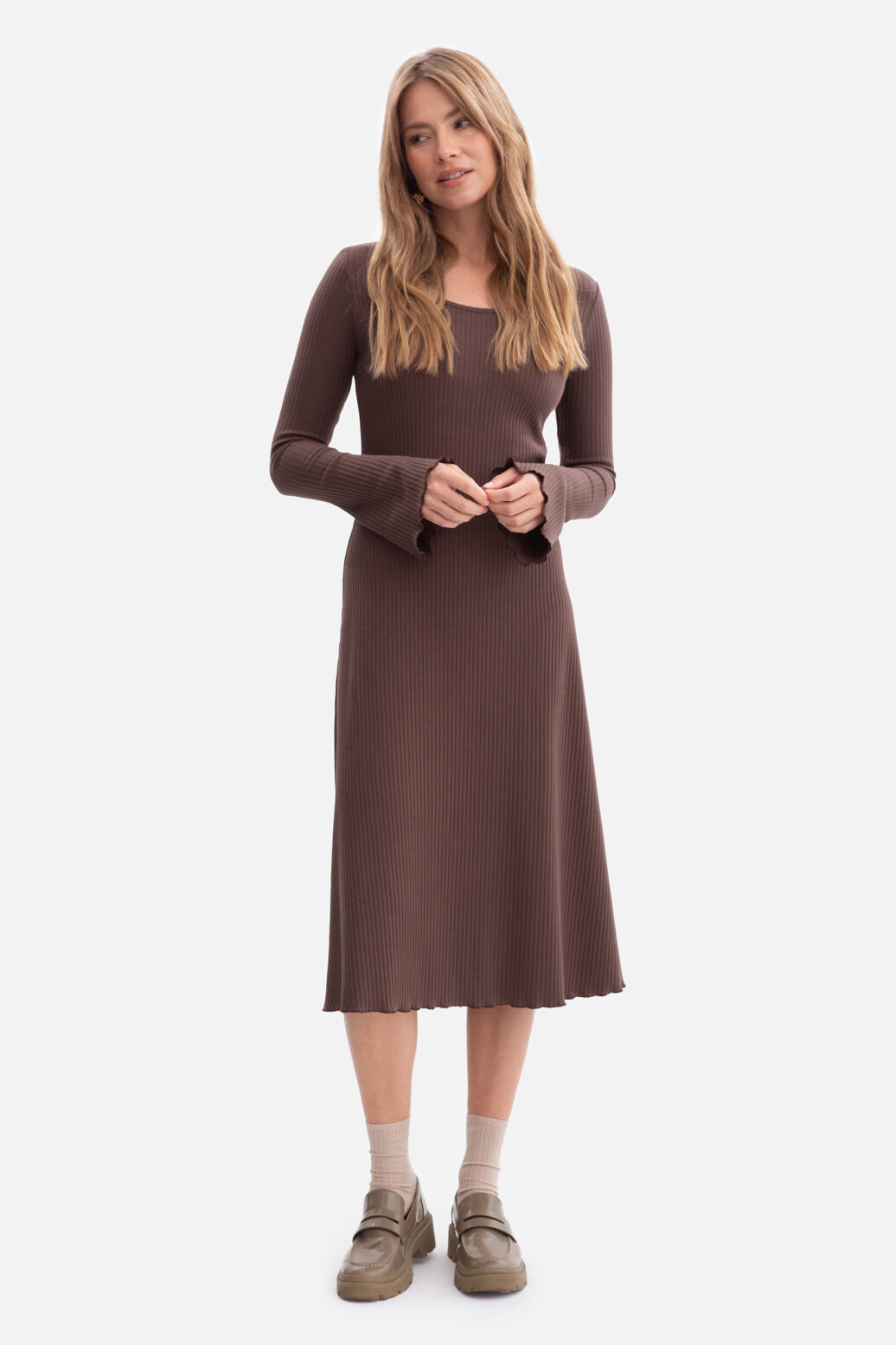 SUKIENKA MIDI Z DZIANINY PRĄŻKOWANEJ Z DEKOLTEM - GORZKA CZEKOLADA